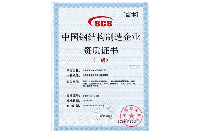 中国钢结构制造企业资质证书(一级)