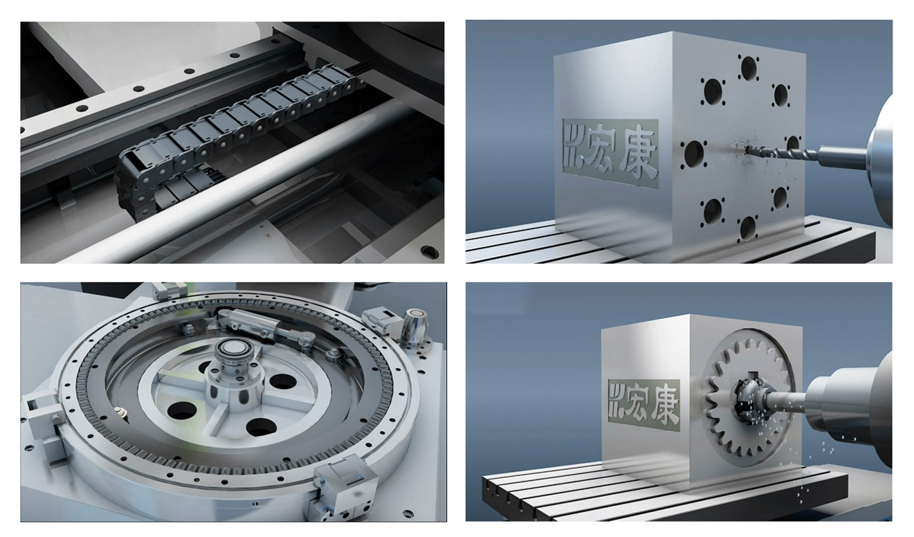 2、超短圆柱滚动回转工作台专利(专利号:ZL 2010 1 0281167.1)技术,使工作台支撑能力和可靠性显著提高。3、各坐标轴伺服进给装置全部采用交流伺服电机驱动、应用预紧式滚珠丝杠、专用角接触成组轴承支撑;4、上滑座、立柱采用直线导轨结构,精度高,便于安装调试。5、主轴箱采用氮气平衡系统,更加稳定、可靠、安全。6、拖链内置技术,有效保护管路运行系统、减少故障率,提高整体美观度。